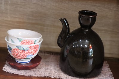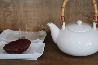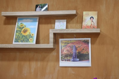 떡카페 안에는 여러 개의 다기가 놓여있었습니다. 한쪽으로 국화차를 만들기 위해 말리고 있는 국화꽃을 놓여 있었어요. 마치 방금 전 명상을 마친 모습인 것처럼 행복한 미소를 지으며 한 여인이 차를 앞에 두고 앉아 있는 그림이 벽에 걸려 있어요. 이곳 '비건으로'의 분위기가 이 그림 속에 담겨 있는 듯합니다.