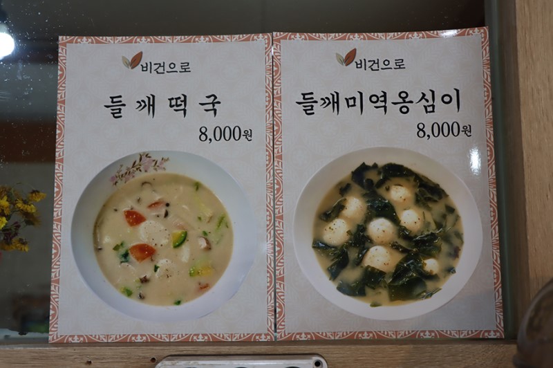'비건으로'에서 판매되는 모든 음식이 비건식이고, 운영하는 사장님도 18년째 비건채식을 하는 분이셨어요. 떡카페라는 이름으로 운영되고 있었는데 간단히 식사할 수 있는 메뉴가 2가지 더 있었어요. 들깨 떡국과 들깨 미역옹심이예요. 예전 다른 곳에서 운영하실 때에는 들깨 칼국수도 메뉴에 있었는데 들깨와 밀가루 궁합이 맞지 않다는 것을 알게 되어 메뉴에서 뺏다고 하시네요. 저는 들깨 미역옹심이를 주문했습니다.