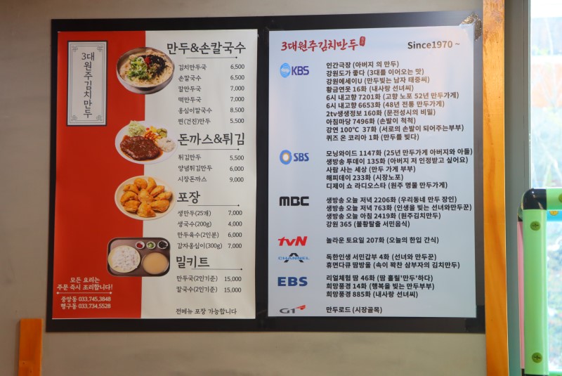 각 방송국에서 촬영을 많이 한 곳이였어요. 이런 김치만두 집이 있다는 것을 이제야 알았네요. 전 메뉴 포장이 가능하고, 만둣국 하고 칼국수는 가져와서 바로 끓여 먹을 수 있게 밀키트로도  판매를 하시네요.