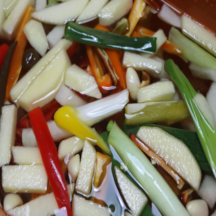 삭힌 고추가 있어 몇개 넣었는데, 바로 먹을 동치미에는 넣지 않아도 돼요.