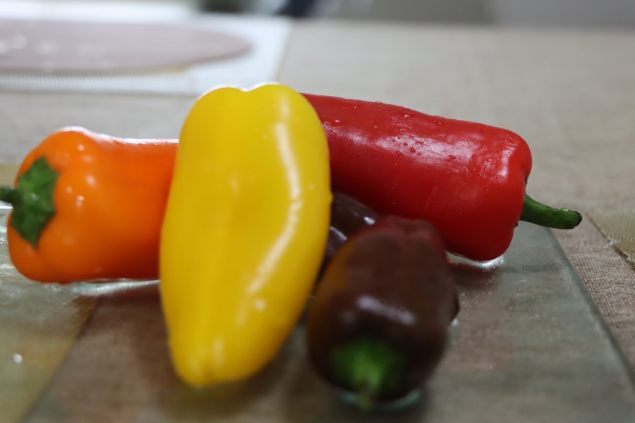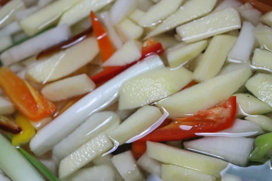 색감때문에 청고추나 홍고추를 넣기도 하는데, 파프리카가 있어서 파프리카를 넣었어요. 파프리카를 깨끗이 씻어 씨를 제거해 주고, 소금에 절여주세요. 사과, 배도 무와 비슷한 크기로 썰어주세요. 기타 재료가 없으면 생략해도 됩니다.