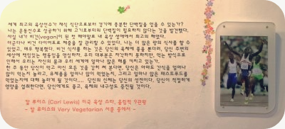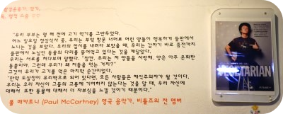 벽면에는 미국 유명한 육상선수 칼 루이스와 영국의 너무도 유명한 비틀스의 폴 매카트니 비건식 이야기가 쓰여 있었어요.