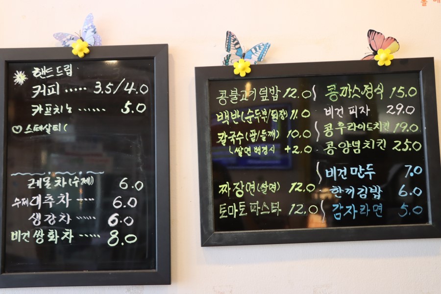 식사류: 백반(순두부,된장), 칼국수, 비건피자외 / 커피외 수제차 비건쌍화차
