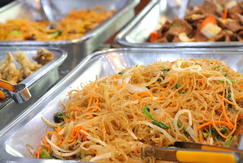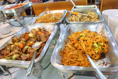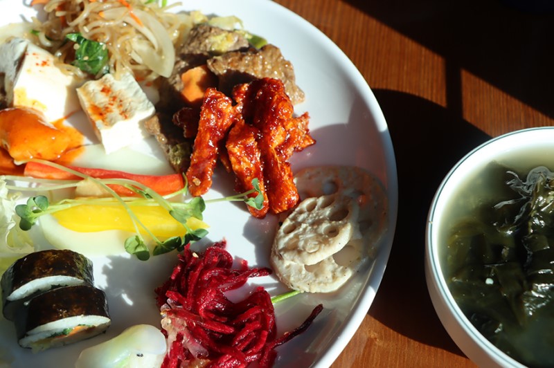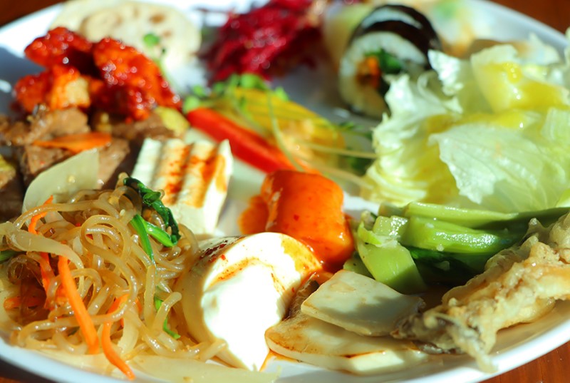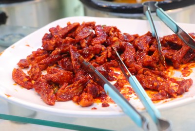 앞쪽에 접시가 있고 바로 탕수육과 잡채, 콩고기, 중국풍 음식맛이 나는 요리가 있어요. 이곳이 비건식당이긴 해도 90퍼센트가 일반인이고 실재 비건인은 10퍼센트가 채 안된다고 해요. 대부분 건강을 위해서 찾는 식당인 거죠. 소모임 식사나 가족 외식하기도 적당한 장소네요.