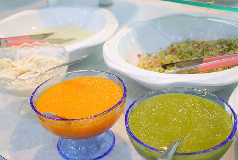 '뜰안채'에서 좋아하는 음식 중 하나가 곤약으로 만든 초밥이에요.^^ 20년도 훨씬 전에 먹어보고 그 후론 먹어 보지 못한 초밥인데 밥 위에 겨자를 넣고 얇게 썬 곤약를 덮어 만들어 놓은 것이 초밥 맛과 조금 비슷하긴 합니다. 맛있다기보다 좀 재미있는 맛이에요. 닭강정 맛이 나는 음식도 있고 다른 채식뷔페에 없는 음식들이 다양하게 있는 편이에요.