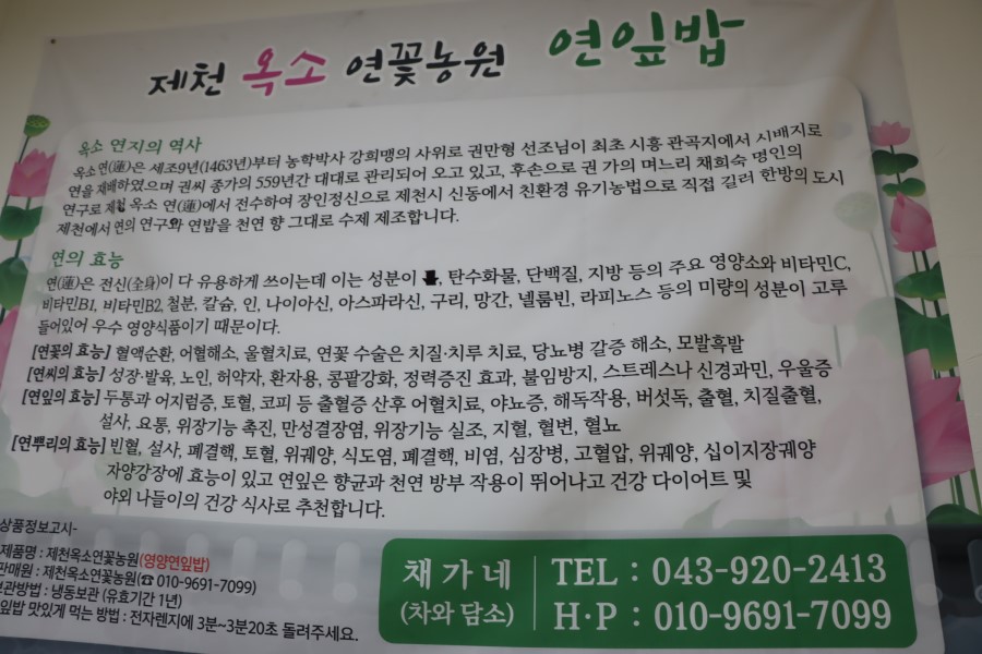 연(蓮)의 명인이 직접 만드신 영양가 듬뿍인 연잎밥을 제천에서 만났습니다. 연잎 속에 찹쌀, 대추, 은행, 연근, 콩등 건강한 재료들이 듬뿍 들어있어 다른 반찬이 필요 없을 거 같았어요. 연잎밥 하나만 먹어도 든든.