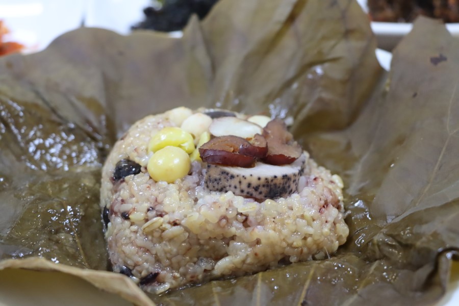 연(蓮)의 명인이 직접 만드신 영양가 듬뿍인 연잎밥을 제천에서 만났습니다.  연잎 속에 찹쌀, 대추, 은행, 연근, 콩등 건강한 재료들이 듬뿍 들어있어 다른 반찬이 필요 없을 거 같았어요. 연잎밥 하나만 먹어도 든든.