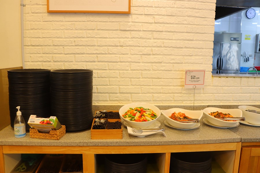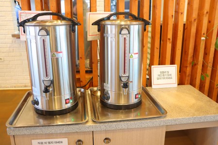 식사를 마치면 따로 마련되어 있는 유기농 커피와 유기농 보이차를 드시면서 이런저런 담소를 나누셔도 돼요. 자리가 넓어서 식사 후에도 느긋하게 앉아서 마시곤 합니다. 후식까지 유기농입니다. 음료 통 옆에 보시면 개인 용기에는 담아가지 말라는 문구가 적혀 있네요.^^