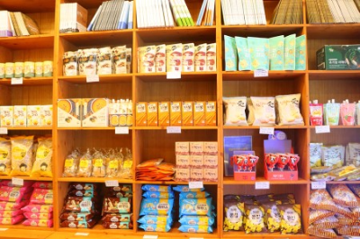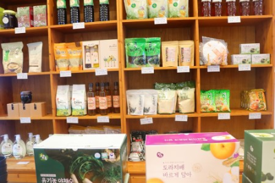 문을 열고 안으로 들어서면 바로 간이매점처럼 여러 가지 스낵과 건강식품들이 진열되어 있어요. 맨 위쪽 라인에는 '열명의 농부' 사장님이 직접 쓰신 상추 재배 관련 책들도 판매되고 있어요. 십 년 넘은 채식당인데 여기 사장님이 유기농 상추 재배로 꽤 이름이 알려진 분으로 알고 있어요. 벽면 한쪽에는 식객허영만선생님이 다녀가신 싸인도 있었어요.