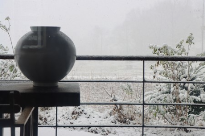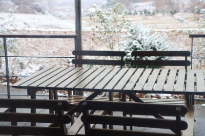여름이면 바깥쪽 테이블에서 저 멀리 산 쪽 풍경을 보면서 식사하면서 산의 경치도 느낄 수 있습니다. 또 바로 앞에 크진 않지만 원래 논이었던 곳을 연못처럼 꾸며놓으셔서 여름과 가을사이에 백련이 피어나 아름다운 연꽃을 보실 수 있답니다. 눈이 내려 그런지 오늘따라 바깥 테이블 백자가 더 고고해 보였어요.^^