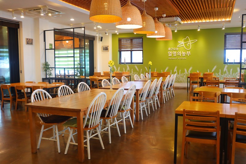 음식이 놓여 있는 위쪽으로 열명 농부의 사진들이 걸려 있어요. 조금 이색적인 풍경이기도 합니다. 한 분 한 분이 모두 신뢰 가는 얼굴들이에요.^^ 농사 지으시는 모든 분들께 감사한 마음이 듭니다. 이곳에 식사 형태는 뷔페식이지만 음식이 그리 다양하진 않아요. 대신 대부분의 음식들이 유기농으로 만들었다는 것이 가장 큰 장점인 식당이죠.