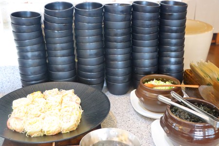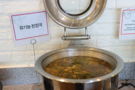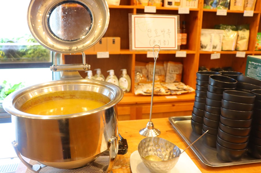 쌈 진열장 앞쪽으로 항상 유기농 단호박죽이 있어요. 다른 뷔페식당을 많이 다녀봤지만 '열명의농부' 단호박죽이 최고인 것 같아요. 많이 달지 않아 맛과 건강 두 마리 토끼를 다 잡은 단호박죽이에요.